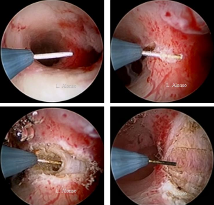 Two different surgical approaches for the septum have been described, the thinning technique and the shortening one. In the thinning technique, longitudinal incisions are performed over each side of the uterus from the base to the apex of the septum. The objective is to reduce the width of the septum and to transform the initial septum in a fundical remnant of tissue that can be incised from one cornual recess to the other. In the “shortening” technique, the septum is incised transversely, starting from the apex towards the fundus. This incision in the midline of the septum, retracts the remaining tissue towards the anterior and posterior uterine walls.