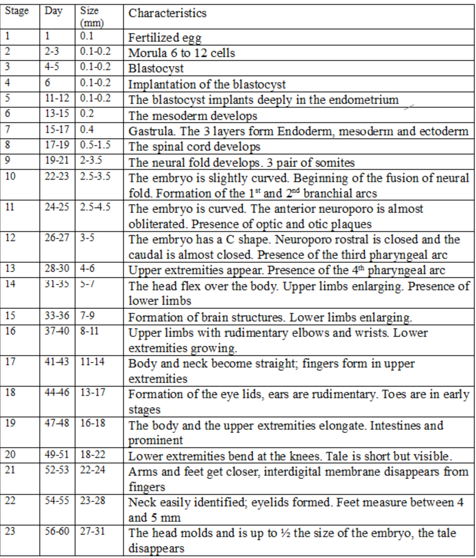 It is important to understand the correlation between the gestational age, the size of the embryo and the morphological characteristics of the embryo. The knowledge of these stages in early phases of the pregnancy is important to determine if there is such a concordance between these characteristics and the expected Carnegie stage.
