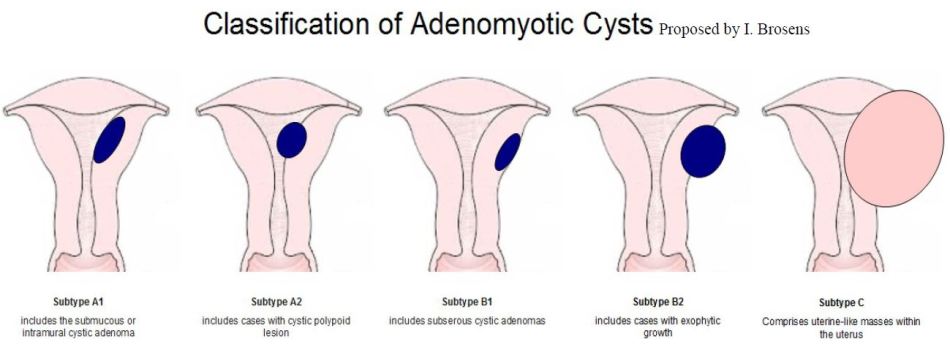 With the use of modern improved imaging techniques, authors have described a growing number of cases in adolescents and young adult women with dysmenorrhea, emerging a new type of adenomyosis called “cystic”. At present, the diagnosis is mainly based on MRI, presenting as a cystic structure with an internal diameter ≥10 mm and hemorrhagic content surrounded by myometrial tissue. In a review of cystic adenomyosis, Brosens et al (2015) described three types (A, B, and C) with their respective subtypes, according to the location of the cyst and the complexity of the lesion