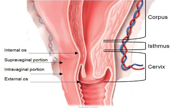 The name cervix derives from the Latin word “Cervic” meaning “neck”. It represents the lower portion of the uterus and communicates the uterine cavity with the vagina. It has a cylindrical shape with a length of about 3 cm and a diameter of about 2 cm. The uterine cervix has an opening to the vagina called the “external os” (EO). In the area of division between the cervix and uterine body lies a fibromuscular area called the “internal os” (IO). The area located between EO and IO is called the “endocervical canal”, which has a fusiform shape and an oval cross section, the endocervial canal has a diameter ranging between 3 and 10 millimiters.