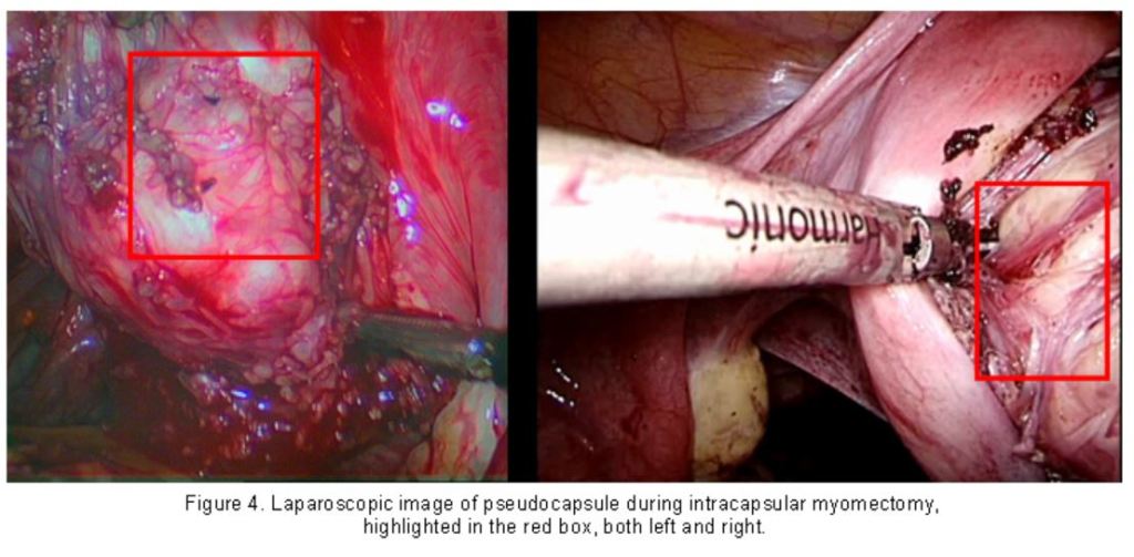 The surgical benefit is visible during and after myomectomy: the bleeding is reduced, the myometrial anatomy is largely respected, the myometrial healing is preserved and enhanced, as confirmed by clinical and ultrasound investigations on scar site after intracapsular myomectomy.
