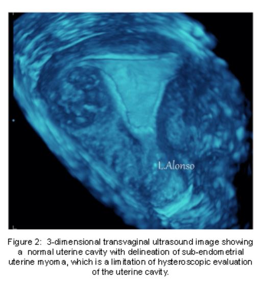 With 3DTVUS imaging, uterine cavity evaluation is enhanced above gray scale 2DTVUS. The 3D scan simultaneously displays three perpendicular image planes creating a detailed image construction of surface detail. One advantage of 3DTVUS over HS is the evaluation of sub-endometrial regions of the uterus as well as the endometrial cavity (Figure 2) . Hysteroscopy, however, still more accurately identifies submucous myomas.