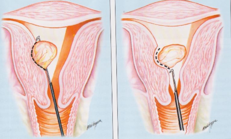 The first incision should always be done through the posterior portion, completely surrounding the endometrium until you reach the pseudocapsule. When reaching pseudocapsule starts the mobilizations of the nodule, with blunt dissection of the myoma pseudocapsule from adjacent myometrium, without cutting the nodule.
